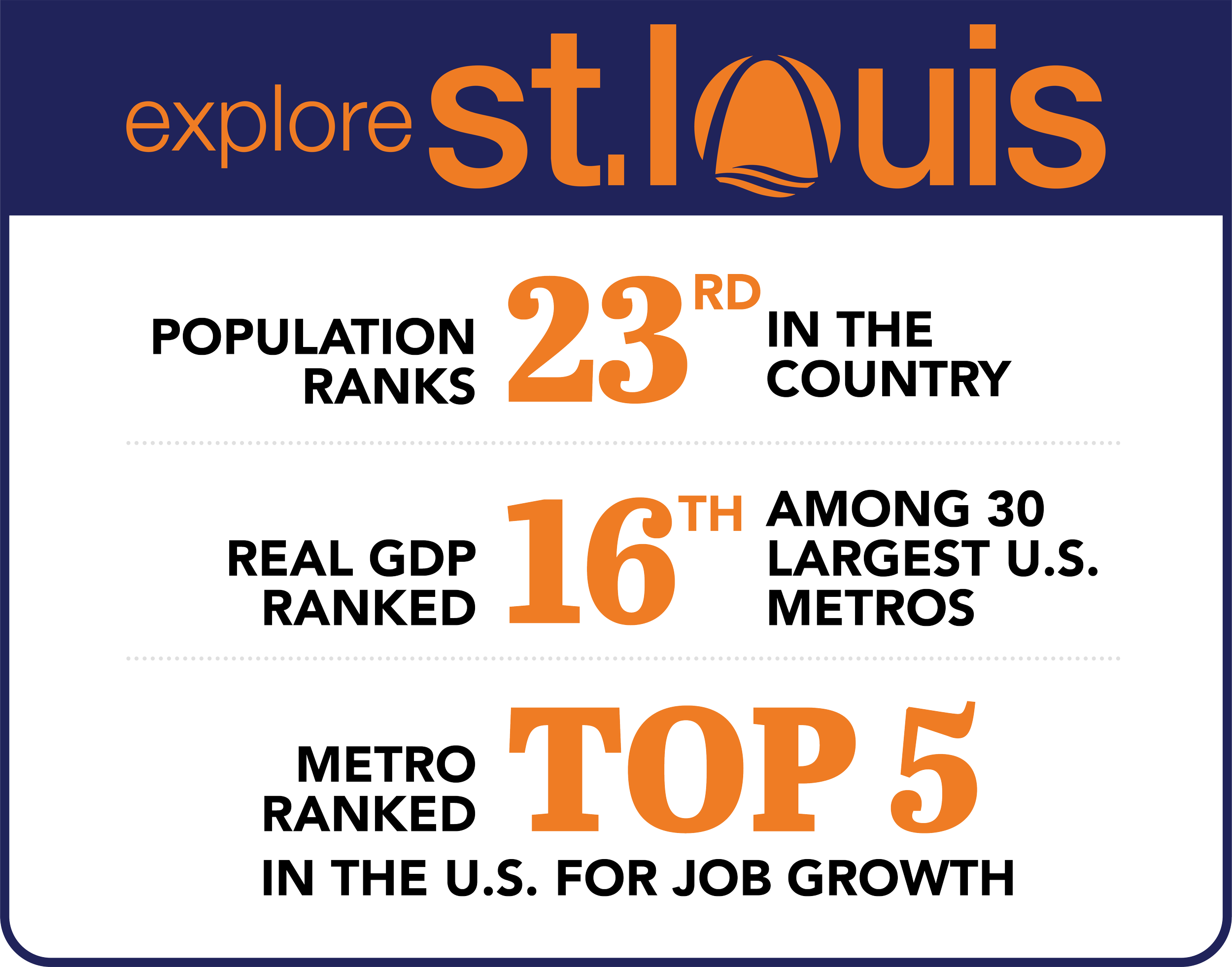 St. Louis’ population ranks 23rd in the country and the real GDP ranked 16th among the 30 largest U.S. metros last year. Several companies have recently made major job announcements and investments, including Boeing, AFG, GM, James Hardie, ICL, Wieland, and several others.